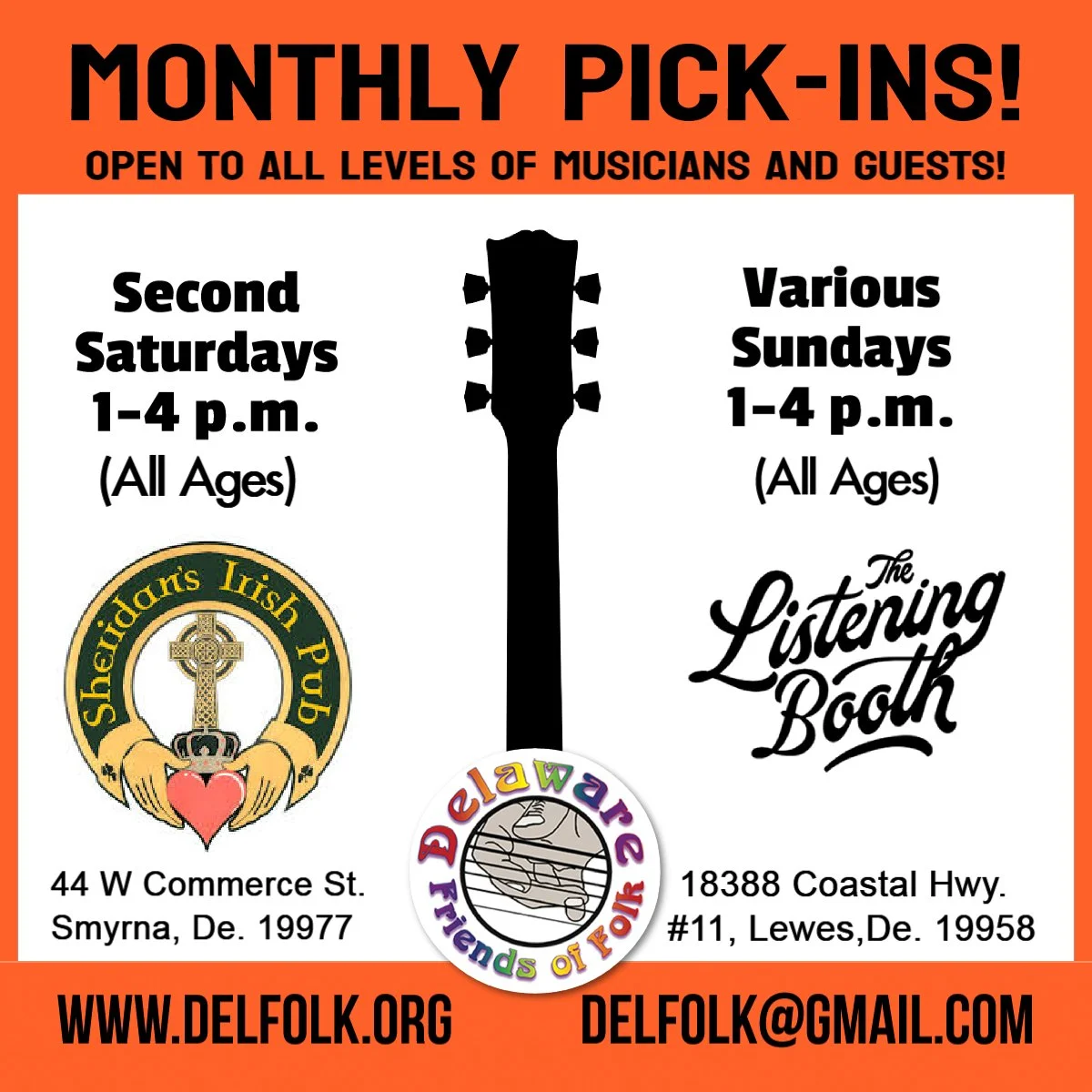 All levels and guest are welcome! Please remember your Pickin’ etiquette. If room allows, we work in a circle, you have a turn to lead or you may pass. Simple chord progressions work best and most importantly, have fun! This is not an open mic, it is just musician folks playing music together.